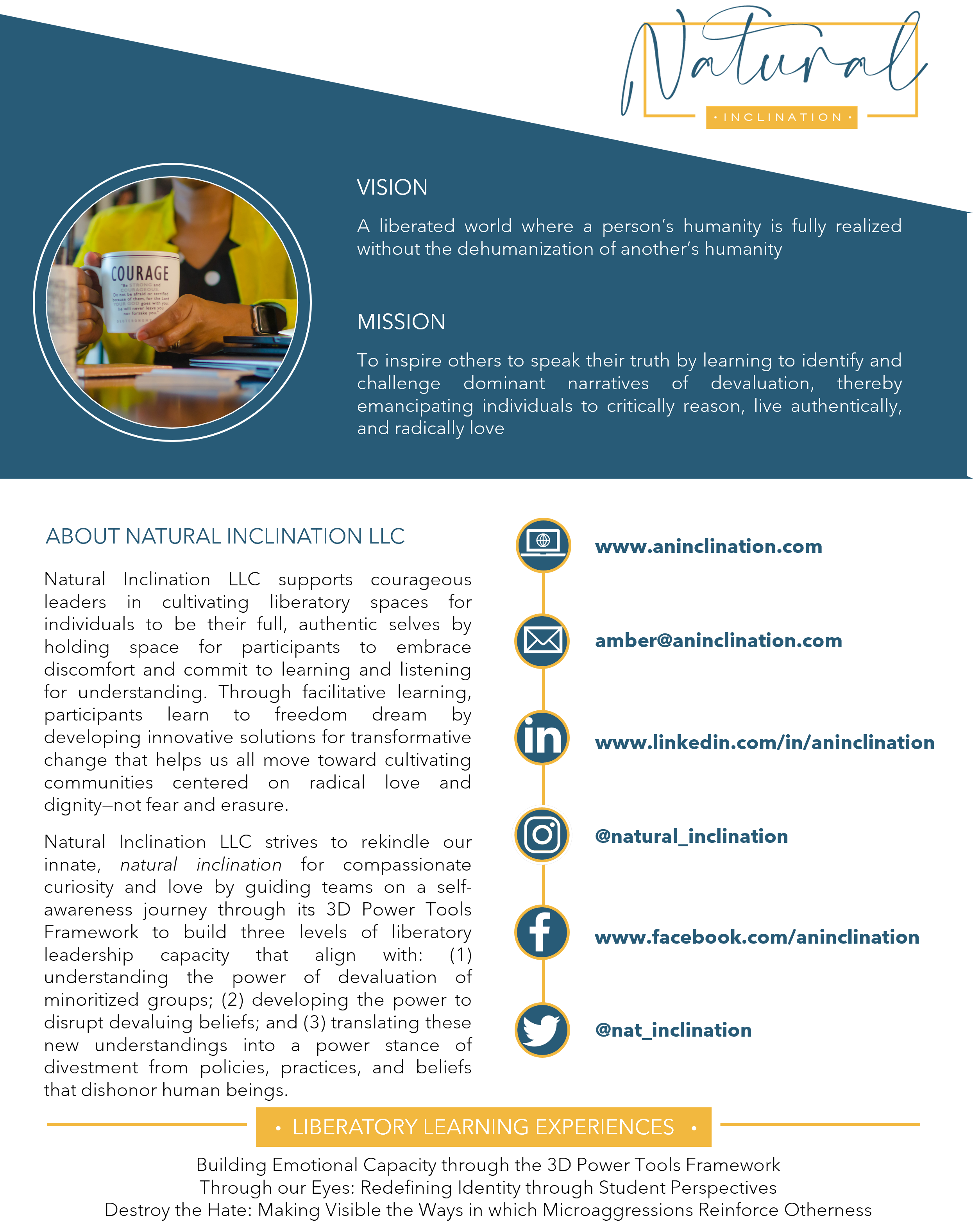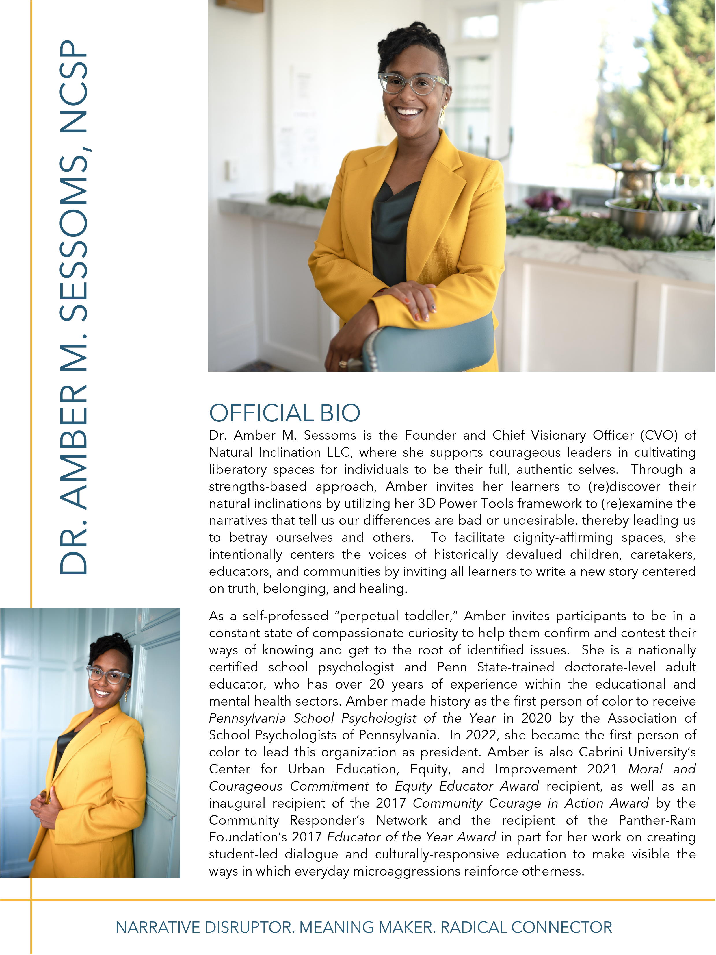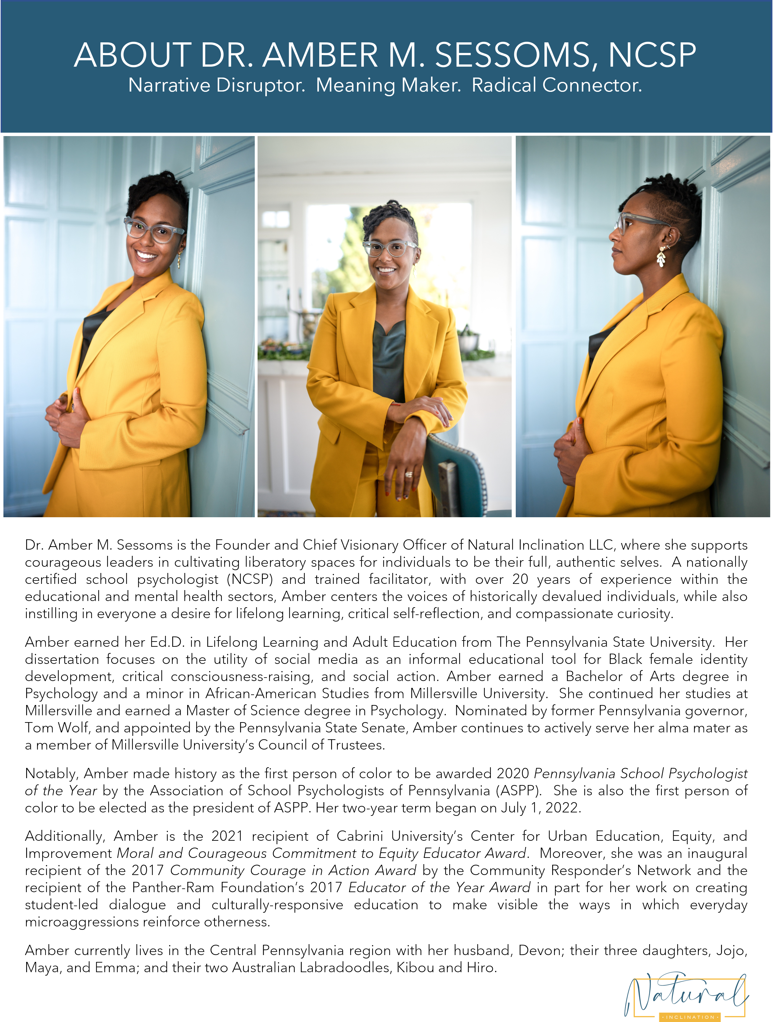 Dr. Amber M. Sessoms is the Founder and Chief Visionary Officer (CVO) of Natural Inclination LLC, where she supports courageous leaders in cultivating liberatory spaces for individuals to be their full, authentic selves. As a self-professed “perpetual toddler,” Amber invites her learners to be in a constant state of compassionate curiosity to (re)discover their natural inclinations by utilizing her 3D Power Tools framework to facilitate writing a new story centered on truth, belonging, and healing.